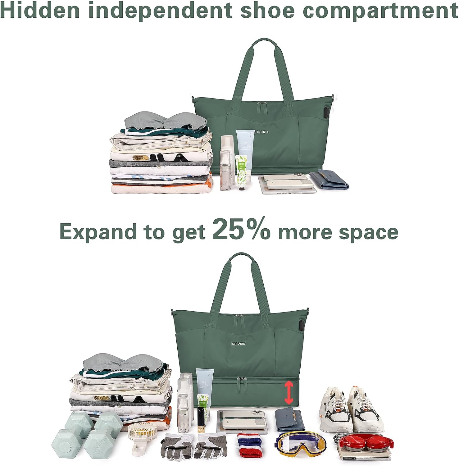 Unlike standard travel duffel bags, the ETRONIK Weekender Bag features a zippered expandable shoe compartment, increasing capacity from 31 liters to 42 liters. You can easily store shoes, workout clothes, or laundry without mixing them with clean items. It even includes two extra shoe bags, perfect for separating footwear or dirty laundry while traveling.