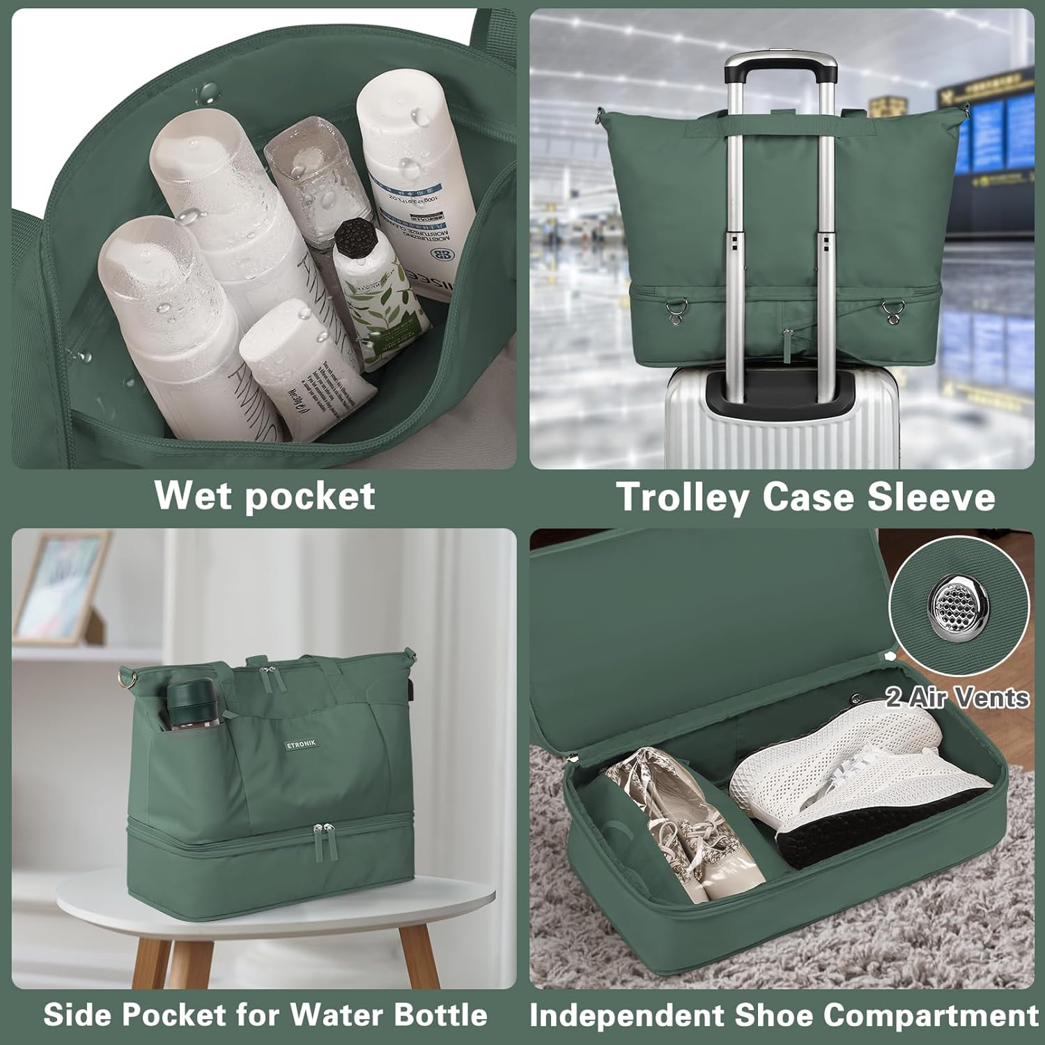 From weekend getaways to business trips, this versatile carry-on tote serves multiple purposes. Use it as a gym bag with a shoe compartment, hospital bag, or even a beach tote. Its modern design and dark green finish add a sophisticated touch to your travel style.