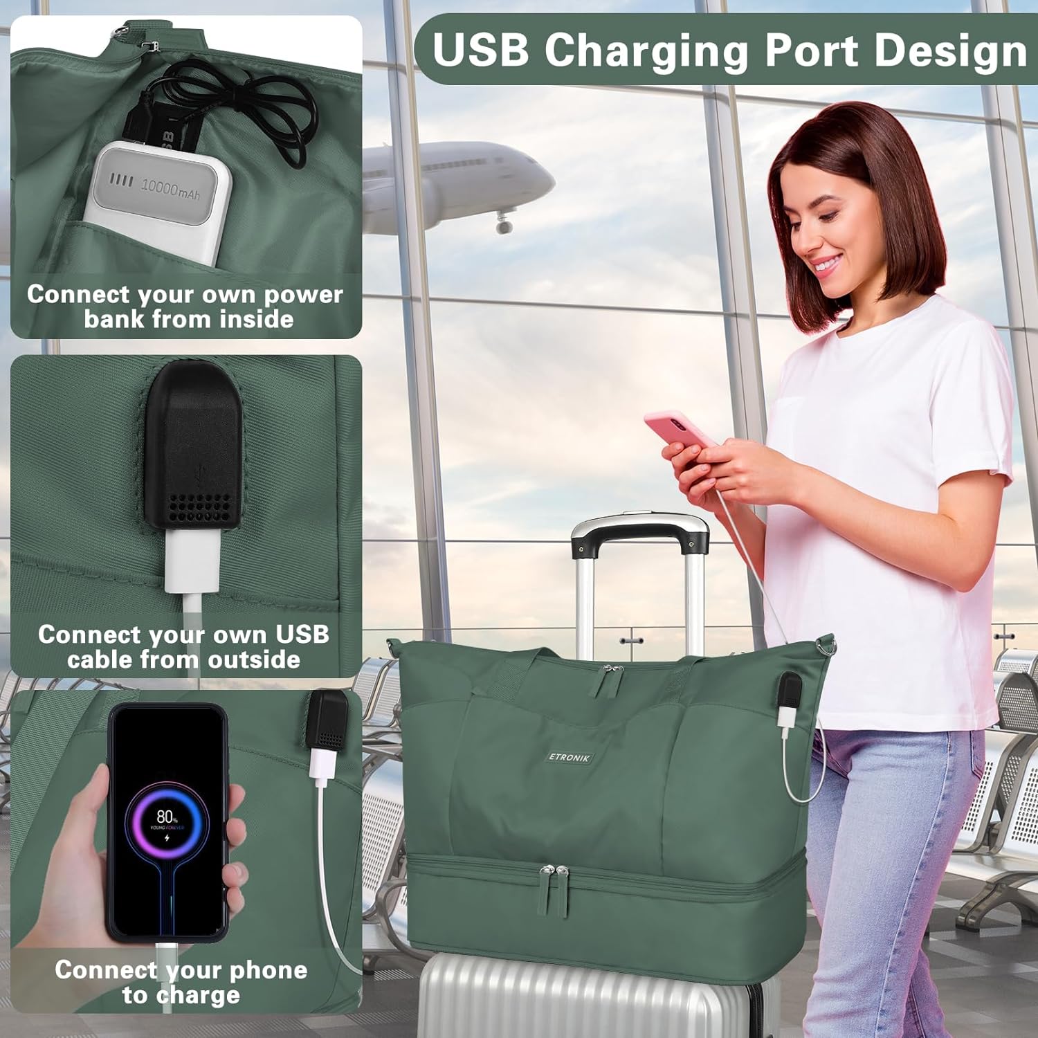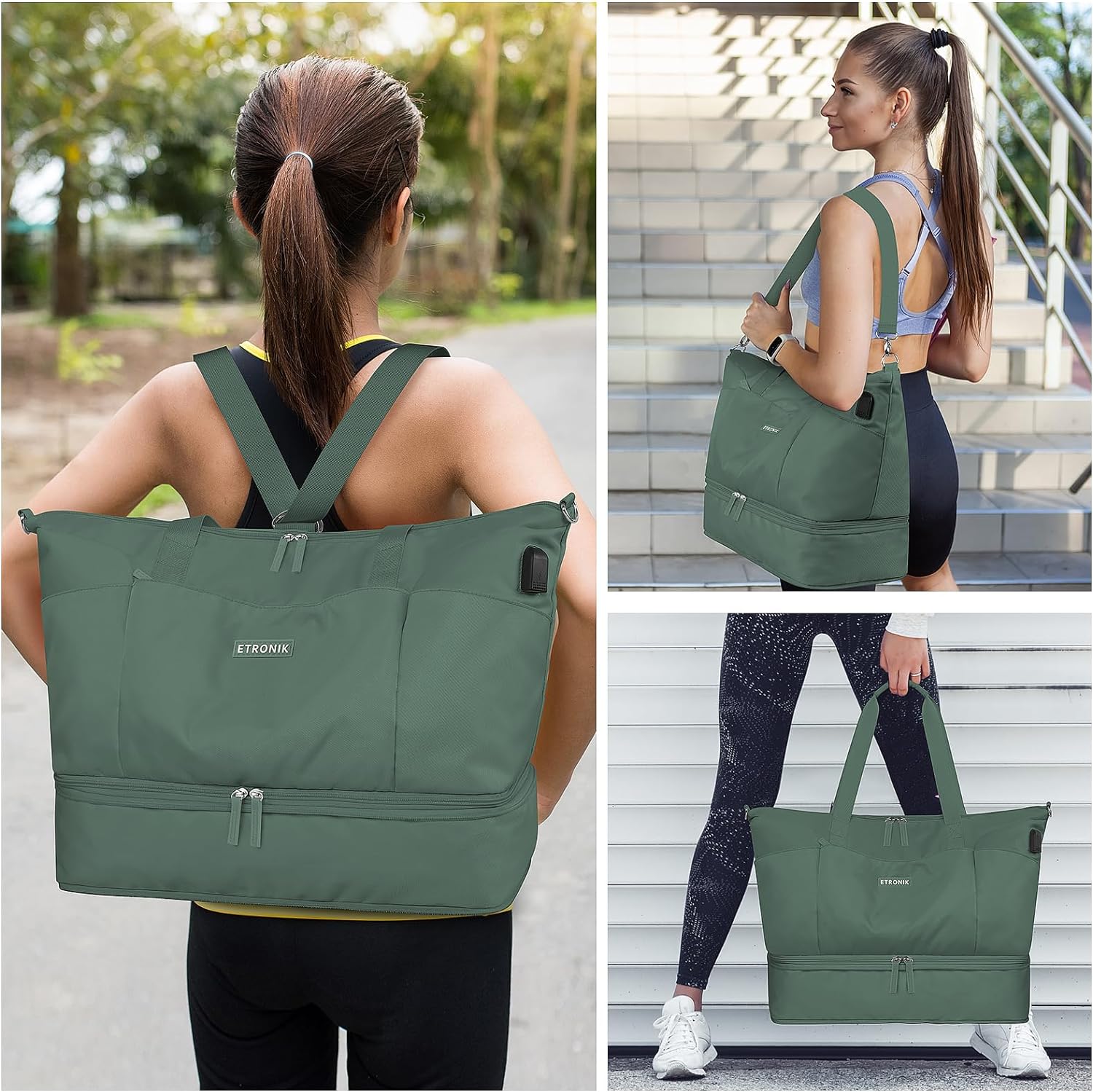 Made from high-quality nylon and polyester fabric, this women’s travel duffel bag is lightweight, waterproof, and tear-resistant. Whether you’re heading to the gym, airport, or beach, the ETRONIK Weekender withstands daily wear while keeping your items safe from rain or spills.